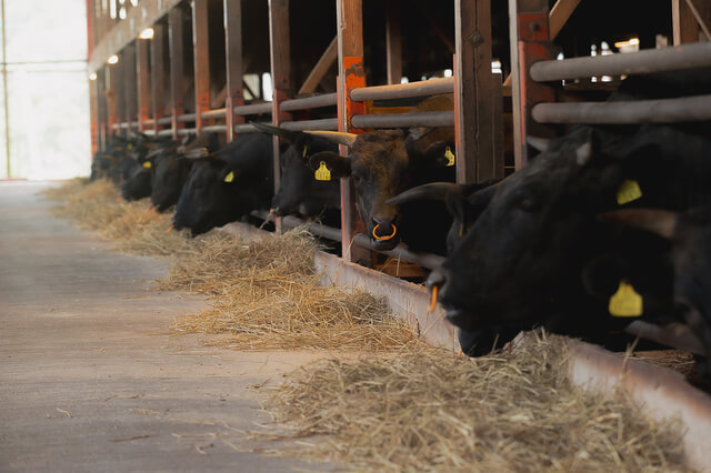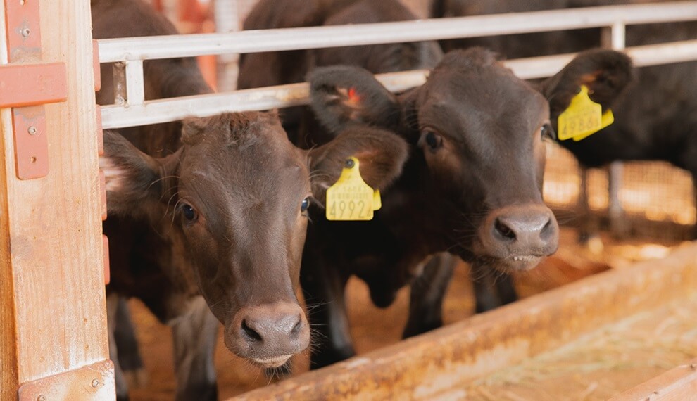 弊社では黒毛和牛の肥育繁殖一貫経営を行っています。飼養頭数は、肥育牛2500頭、繁殖牛900頭と規模も大きいのが特徴。また、農場HACCP認証、JGAP認証も取得しており、安心安全な美味しい牛肉を消費者の方々へ届けています。